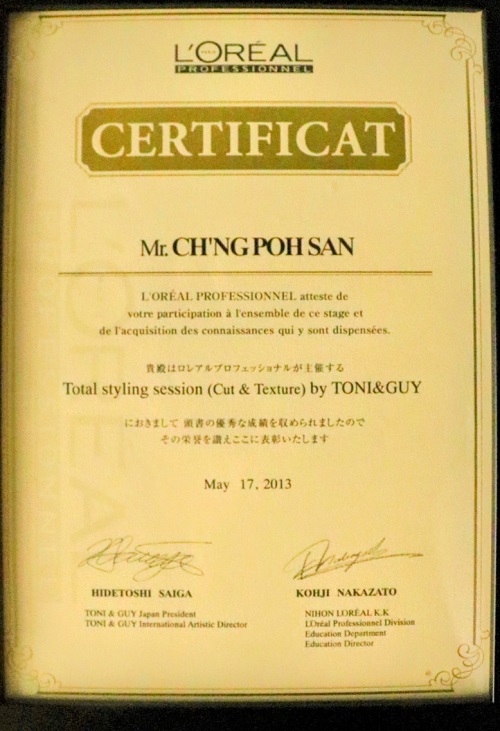 Certificate of Completion for Total Styling Session (Cut & Texture) by TONI & GUY (2013)
