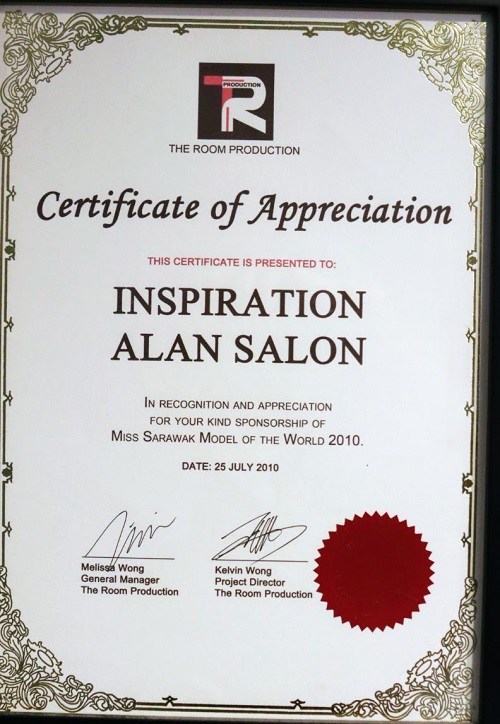Certificate of Appreciation for sponsorship of Miss Sarawak Model of The World (2010)