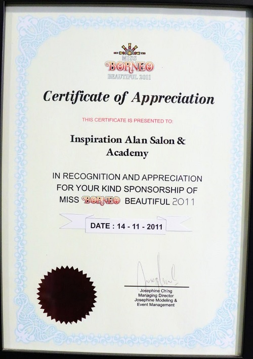 Certificate of Appreciation for sponsorship of Miss Borneo Beautiful (2011)